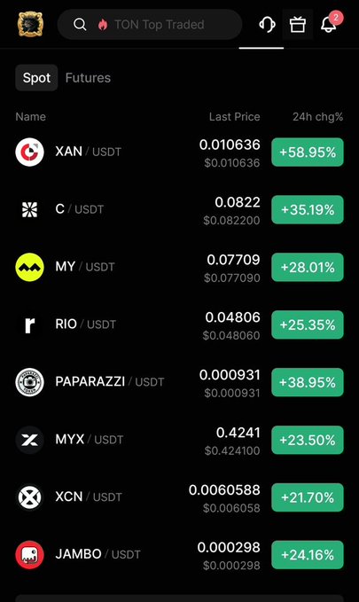 $XAN is leading the pack with a huge 58.95% pump, while $PAPARAZZI also caught my eye with 38.95%. $MY is up 28.01%, $RIO 25.35%, $MYX 23.59%, and $XCN 21.70%.