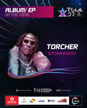 🆕🏆 Stonebwoy earns 8 nominations with 5 different songs at the 27th Telecel Ghana Music Awards. #TORCHERii • Artiste Of The Year • Album/EP Of The Year - The TORCHER EP • Best Reggae/Dancehall Artiste • Best Collaboration - Aso ll • Best SongWriter - Send Dem A Prayer • Best Music Video - SHINE • Best Afropop Song - Gidi Gidi (Fire) • Best Reggae/Dancehall Song - TORCHER — Stonebwoy is the second-most nominated artiste after Black Sherif (with 9 nominations).