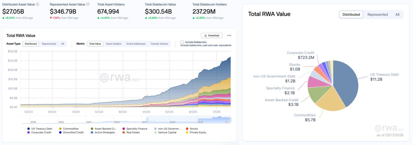 According to the rwa.xyz data dashboard, as of March 17, 2026, on-chain assets continued to reach new highs this period . The total value of RWA on-chain assets further increased from $26.43 billion on March 10 to $27.05 billion, an increase of approximately $620 million in a single week, representing a growth rate of approximately 2.35%. The total value of representative assets also rebounded, increasing from $336.08 billion to $346.79 billion, an increase of approximately $10.71 billion, representing a growth rate of approximately 3.19%.