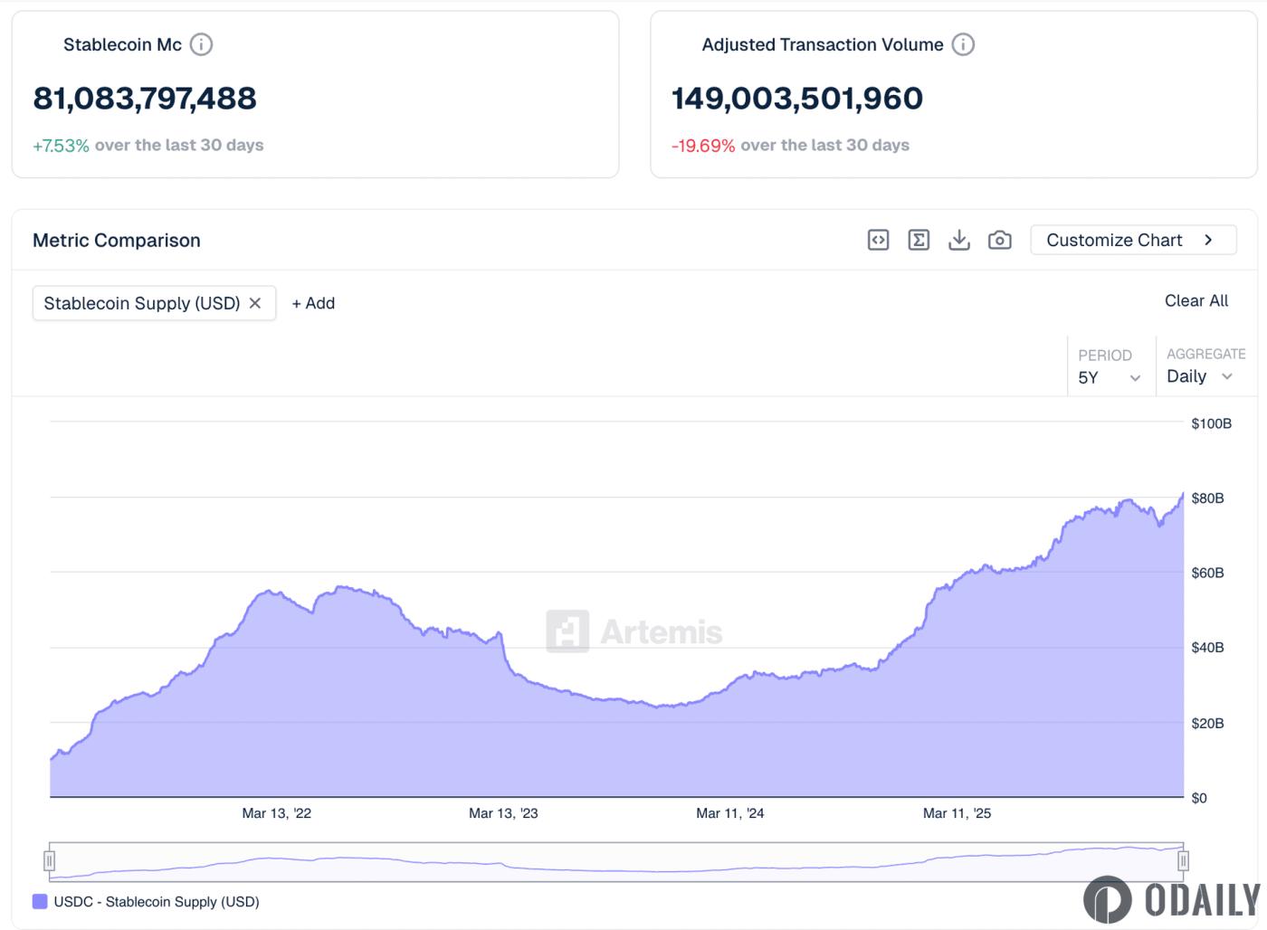 According to Artemis data, the total issuance of USDC across the entire blockchain has exceeded $80 billion for the first time, currently standing at $81.083 billion, setting a new historical record.