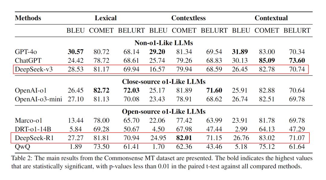 DeepSeek's performance in a commonsense translation test reflects its multilingual capabilities | Image source: Harbin Institute of Technology team paper "Evaluating o1-Like LLMs: Unlocking Reasoning for Translation through Comprehensive Analysis"