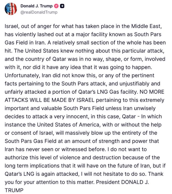 Gm gm fams Ww3 update Trump just said the US “knew nothing” about Israel hitting South Pars But this isn’t some random target it’s the largest gas field on Earth Either coordination broke down or something bigger is happening behind the scenes THIS IS A MAJOR WORLD CRISIS‼️