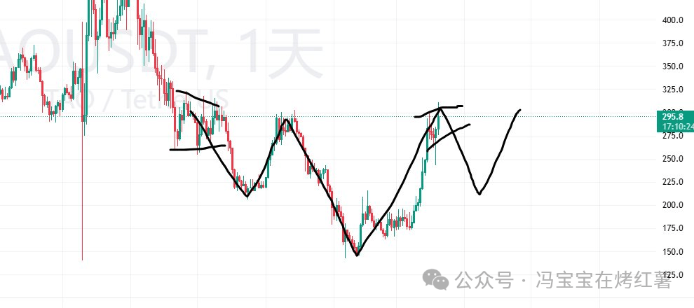 Tao is currently oscillating within a large range on the daily chart, exhibiting independent movement, and has doubled in value since bottoming out. It has now touched a strong resistance zone at the 300-315 V-shaped neckline; a breakout above this level could lead to a reversal.