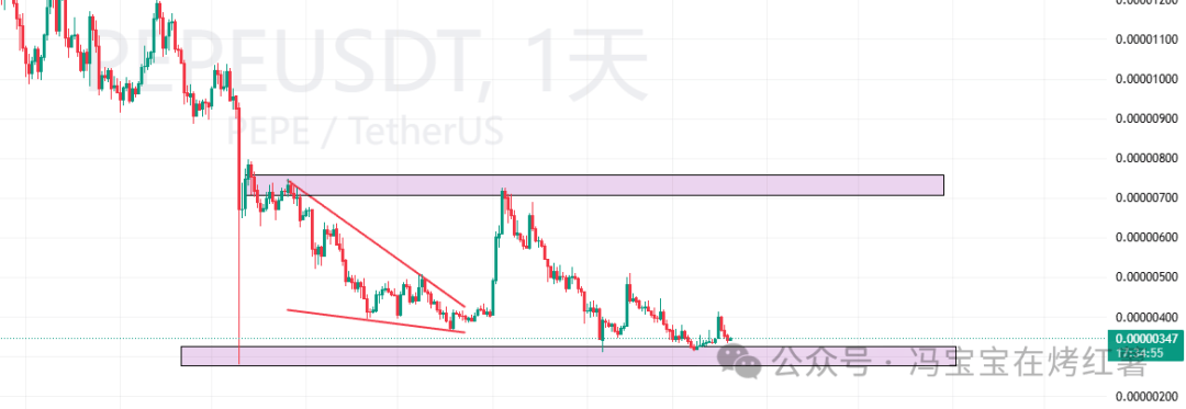 PEPE has retraced over 90% from its high and is currently consolidating with decreasing volume, its price approaching the previous daily low. If the 0.30–0.28 support level holds, a rebound from oversold conditions is highly probable. The previous bullish wedge pattern was a standard pattern, and the retracement was precise.