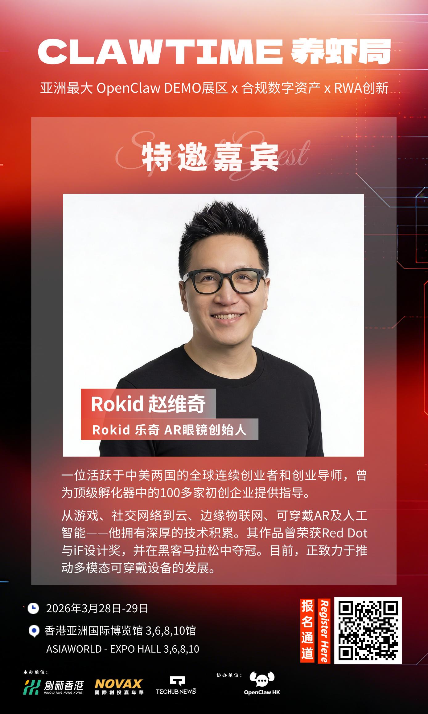 According to Techub News, Zhao Weiqi, founder of Rokid AR glasses, has confirmed his attendance at CLAWTIME, Asia's largest lobster special zone, as well as the largest OpenClaw DEMO exhibition area in Asia and the X RWA innovation compliant digital asset exhibition.