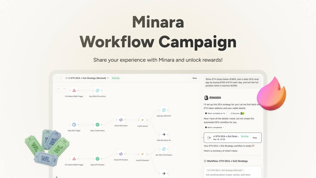 ๐ข Minara AI Season 2 - Workflow Campaign Launch Announcement ๐บ Minara's Workflow Campaign has finally begun! This is a limited-time event running for exactly 7 days, offering a golden opportunity to show off your own smart workflow and earn generous Spark rewards. ๐ฅ ๐ Event & Reward Details * Basic Reward: 100 Spark per participating post * Additional Reward: 500 Spark will be awarded to 3โ5 high-quality posts selected daily! ๐ Detailed Schedule & How to Participate * Event Period: March 19 (Thu) 01:00 ~ March 27 (Fri) 08:59 * How to Participate: 1. Create a result using Minara Workflow in any format (screenshot, Twitter thread, video, article, etc.). 2. Please share details about the workflow you created, its logic structure, and your actual usage experience. * Reward Claim Procedure: 1. Share the content you created in the official community. 2. Create a ticket in the channel on Minara Discord. 3. Submit the tweet link and your Minara account email to complete the process! ๐ก Workflow Example Ideas * Automated daily reports combining BTC technical analysis and the latest news * Real-time tracking of two Polymarket high-win-rate smart money wallets (excluding high-frequency traders) * Setting up alerts for specific wallet monitoring and AI-based trade quality analysis * Automated buy/sell strategies based on ETH price conditions (e.g., buy below $1,800, sell all at $2,400) ๐ก Comments The key is to go beyond simply trying out the features and share your own "secret strategies" that help with actual profits or analysis! Become the winner of the 500 Spark bonus selected daily! ๐ #MinaraAI #Display #Storyteller