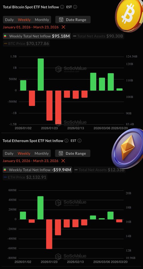 US ETF Inflows - Week 12, 2026 🟢 BTC + $95.18 million Volume: 90.3 billion USD 🔴 ETH - $59.94 million Volume: $12.33 billion 🟢 XRP + $636.48 Volume: $1.01 billion 🟢 SOL + $21.1 million Volume: $874.61 million