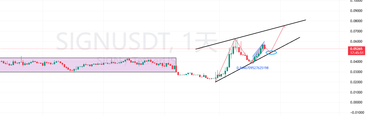 SIGN is showing strong momentum. After a long period of consolidation, most of the low-level shares have been accumulated, resulting in highly concentrated holdings and strong control by major players. It has been rising for a considerable time without a pullback, making a short-term sell-off or crash highly unlikely. The daily chart shows a rising wedge pattern, currently retracing to a support level. A long position can be long around 0.052, with additional positions added at 0.05. A strict stop-loss should be placed if it falls below 0.048-0.049, with an upside target above 0.07. This could be a worthwhile opportunity to profit from a potential rebound.