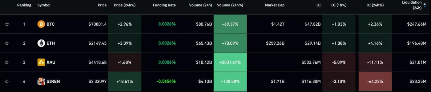 However, when its "surge" was widely discussed online a couple of days ago, its total liquidation volume ranked fourth, only behind Bitcoin, ETH, and XAU, at approximately $23.25 million. If it weren't for Trump's renewed TACO-related actions that boosted gold's volatility, SIREN would have been third.