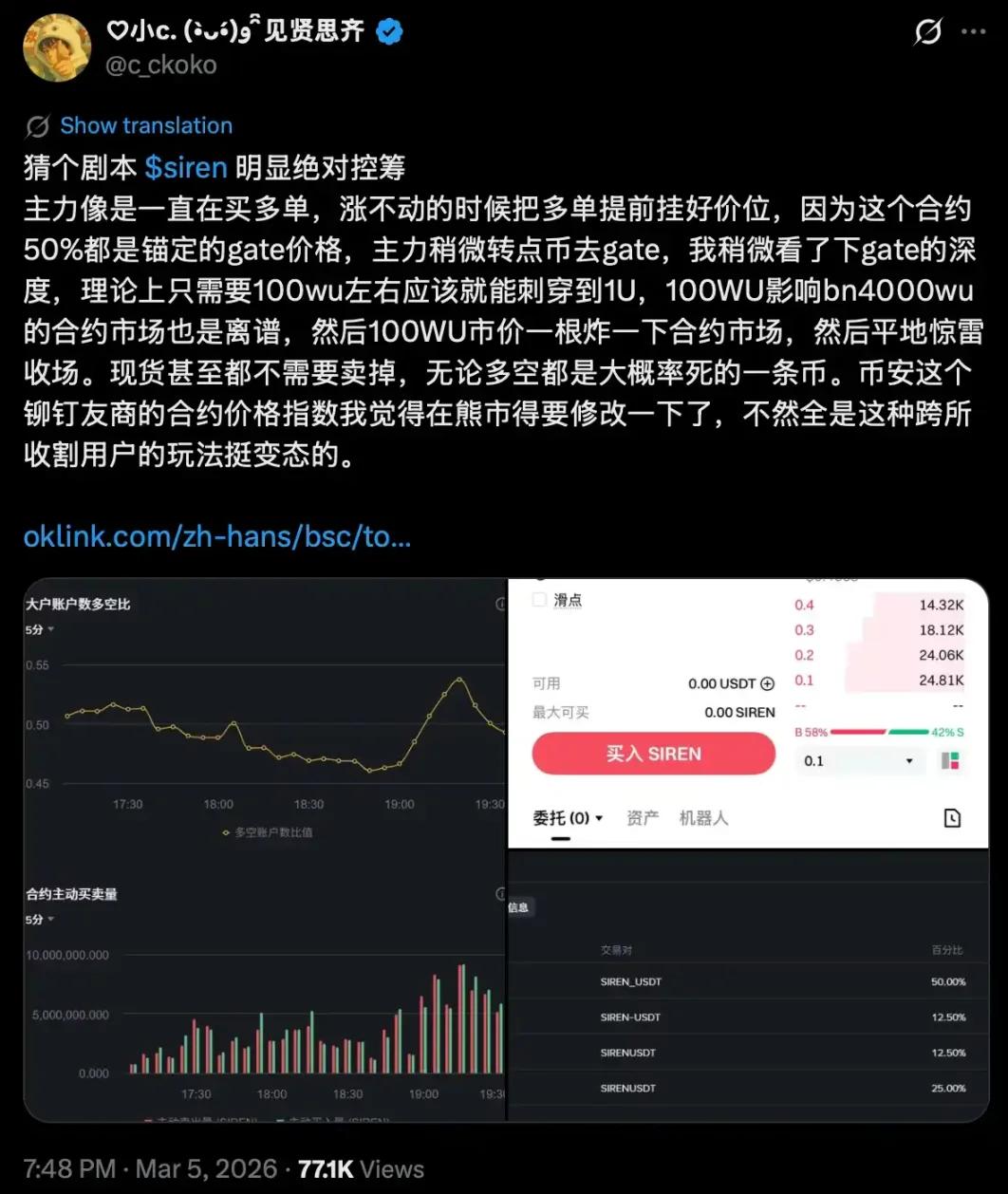 As early as March 5, @c_ckoko tweeted that "$SIREN clearly has absolute control of the tokens, which is a way to harvest users across different exchanges."