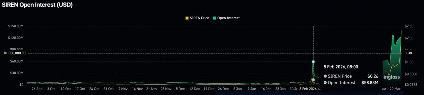 Looking at the open interest, $SIREN showed obvious anomalies starting from February 8th. The open interest, which had been hovering around $3-5 million for a long time, suddenly surged to $58.83 million.
