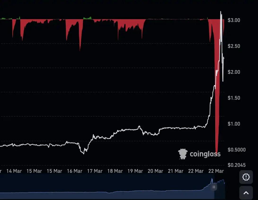 As seen in the fee chart above, starting March 14th, $SIREN frequently exhibited high negative fees, with short sellers continuously feeding money to the market makers' long positions. The market makers then used this "free" funding to further push up the price. In the early morning of March 23rd, the Gate.io spot market experienced a dramatic 78% fluctuation within 10 minutes, with a corresponding trading volume of only about $450,000. The price of $SIREN rose from $2.75 to nearly $5. This means that many people were liquidated.