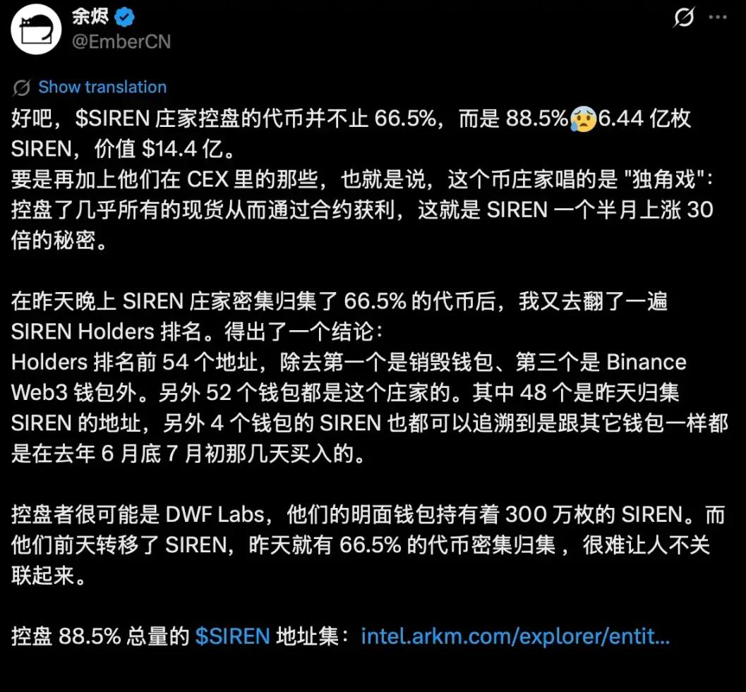 On-chain analyst EmberCN (@EmberCN) compiled data on the market control of $SIREN and found that as much as 88.5% of $SIREN is controlled by a major player, based solely on on-chain data. If the portion deposited by the major player into the CEX is included, the figure would be even higher.