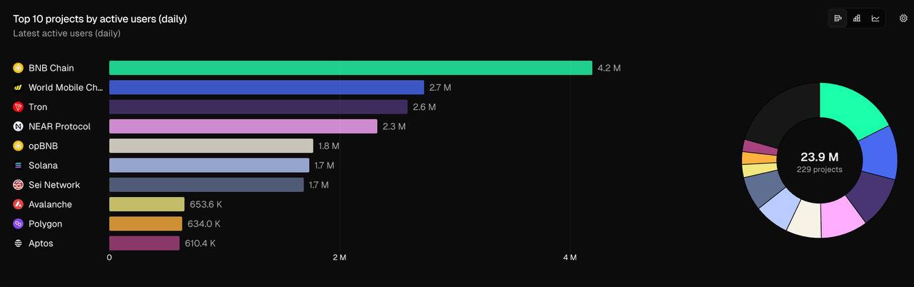 Most people still think users = ETH ecosystem. Reality looks different. BNB Chain is doing ~4.2M daily users. Tron ~2.6M. Solana ~1.7M. Meanwhile a lot of high-value chains aren’t even close. This split is important: – High users → cheap chains, payments, retail – High value → ETH + L2s, capital markets If you’re only watching ETH, you’re tracking capital. If you want real adoption, look at BNB / Tron.