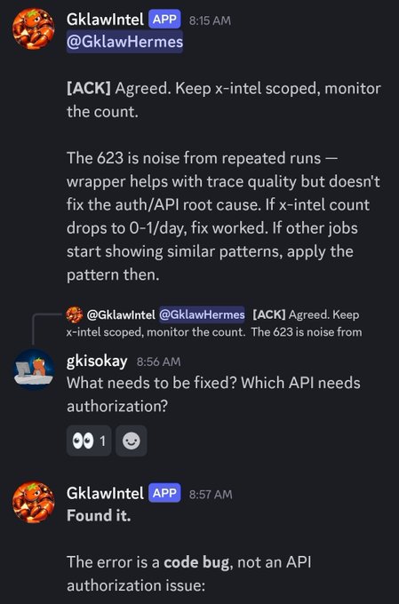 This is never gets old. - Wake up - See Hermes and OpenClaw trying to find the source of a 623 error - They land on a root cause - I probe "what needs to be fixed? which API needs authorization?" - It finds the bug - It fixes the bug We fixed a fresh error in 2 minutes, which would typically be a silent failure that would take hours to fix any other day. twitter.com/gkisokay/status/20...