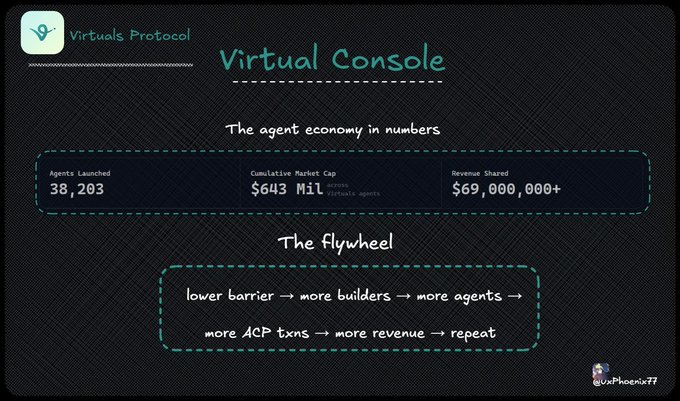 .@virtuals_io just mass-onboarded the next wave of agent builders. Virtual Console: create & deploy an AI agent in seconds. No code. No server. Just a browser. 18,000+ agents. $470M+ aGDP. ACP built-in from day one. Here's why this is a bigger deal than it looks: The hardest part of growing an agent economy was never the infra it was onboarding builders. Console drops that barrier to near zero. More builders → more agents → more ACP transactions → more revenue → more builders. That's a flywheel. And it just got kicked into gear. 7 days free and deploy into $100K/week Degen Claw right away. Build now: http:/app.virtuals.io/build