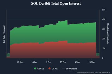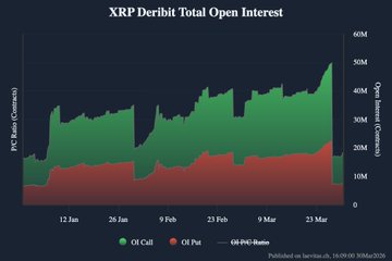 Following the Mar 27 expiry on Deribit, open interest declined sharply across BTC, ETH, SOL, XRP, TRX, and AVAX. BTC declined from 518.98K to 334.81K contracts (−35.5%), now at 361.37K ETH decreased from 2.85M to 1.85M (−35.1%), now at 1.96M SOL OI dropped from 3.71M to 447.01K (−87.9%), now at 529.16K XRP fell from 49.96M to 14.91M (−70.2%), now at 18.44M TRX dropped from 37.11M to 21.95M (−40.9%), now at 24.94M AVAX dropped from 1.15M to 590.9K (−48.6%), now at 660.3K