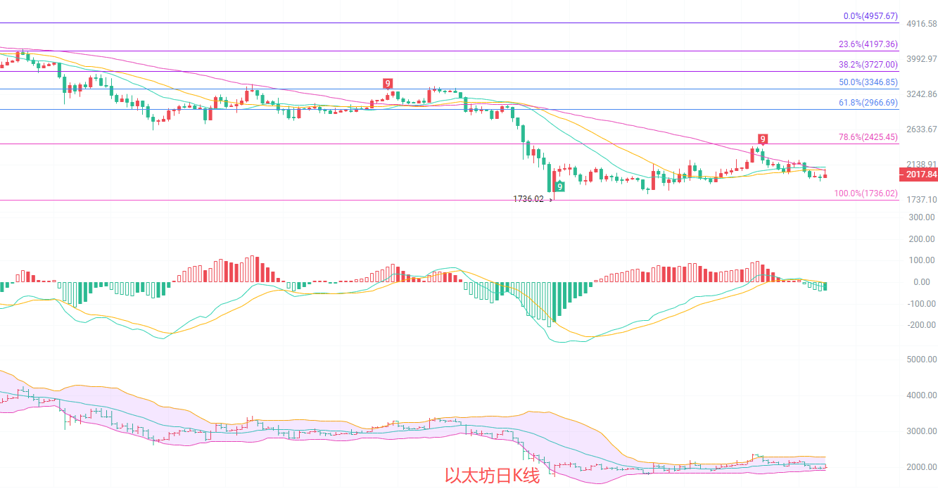 The daily candlestick chart shows the current price at 2029, a 2.32% increase from the previous day, successfully recovering some of the losses, but still below the 20-day moving average (2115), with short-term moving averages providing resistance. The MACD histogram continues to expand, and the DIF line has crossed above the DEA line, forming a golden cross, indicating a clear short-term upward trend. However, insufficient volume suggests a rebound rather than a reversal. The 0.786 Fibonacci retracement level at 2425 is the medium-term target, while strong support lies at 1736. Overall, the price is showing a bottoming-out and rebound pattern, but the southward trend still holds the upper hand.