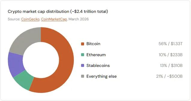 Bitcoin accounts for approximately 56 cents of every dollar in the crypto market. Combined with Ethereum and stablecoins, this represents 79%. The top 10 tokens together account for about 90% of the total market capitalization. The remaining approximately $230 billion is distributed among tens of millions of other tokens.