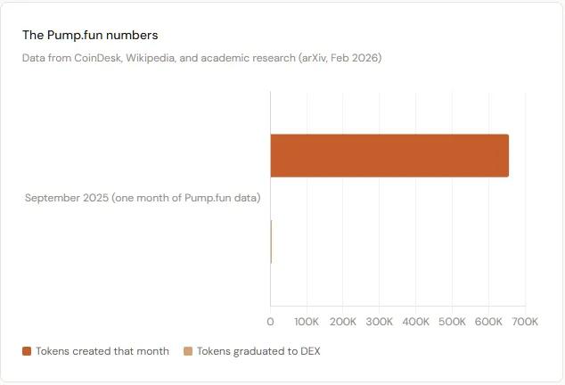 A research paper published in February 2026 analyzed one month's data from Pump.fun : In September 2025, 243,123 different wallet addresses created a total of 655,770 tokens, of which only 4,338 "graduated" and were listed on decentralized exchanges, a graduation rate of 0.63%.