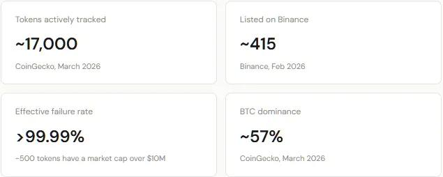 CoinGecko tracks approximately 17,000 tokens, with 415 listed on Binance. The difference between "existence" and "substantial liquidity" is enormous.