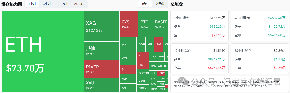 In the past 24 hours, a total of 62,545 people across the internet have had their positions liquidated, with a total liquidation amount of $239 million. Long positions were liquidated for $111 million and short positions for $129 million.