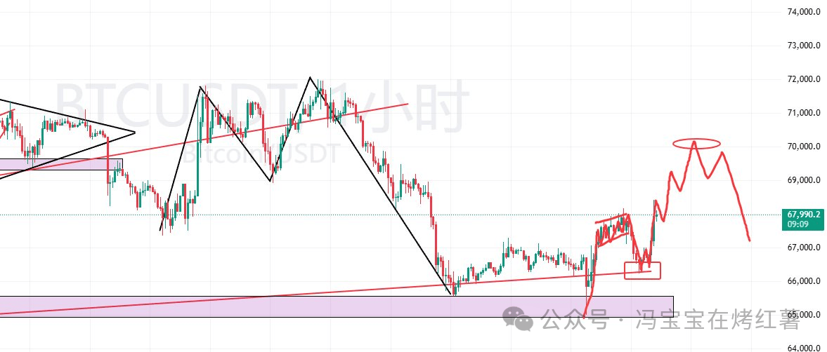As long as it doesn't fall below 66,000, there should be a short-term rebound, with a target of around 70,000. If it's strong, it might even reach 70,000 directly. At that point, I plan to close my long positions and switch to short positions. Once it reaches that level, I'll consider short.