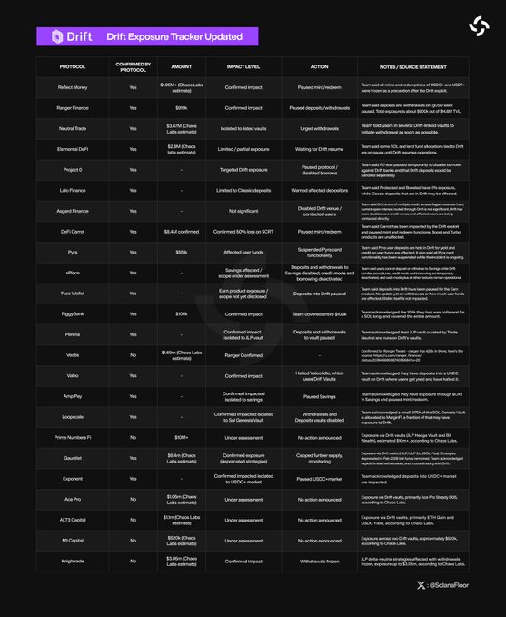 🚨New: @DriftProtocol exposure tracker updated with more Solana projects confirming impact levels and the amount affected by the $285M exploit.