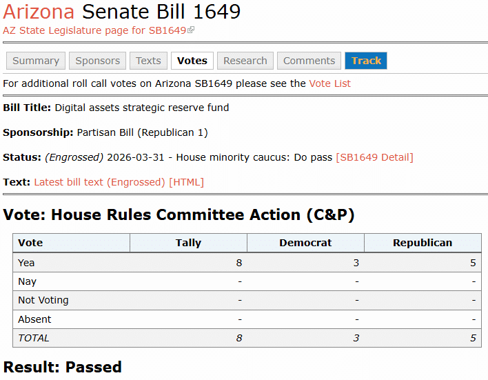 Meanwhile, Arizona lawmakers are also advancing Arizona Senate Bill 1042, which would allow the state to invest up to 10% of its public funds in cryptocurrencies. These proposals place Arizona among the states exploring deeper integration of digital assets into public finance.