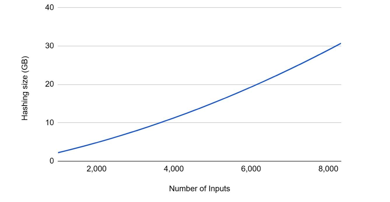 The horizontal axis of this table stops at slightly more than 8,000 inputs because the transaction size is now close to 1MB, which is the maximum space a transaction could use before Segregated Witness. To verify this transaction, the node needs to hash more than 30GB of data. This is an attack transaction, and in our very basic (and potentially inaccurate) case, the worst-case scenario it could cause. Our understanding is that the amount of data that needs to be hashed (not the number of ECDSA signature verifications) is the key indicator of the danger of such complex transactions, so we only focus on this metric.
