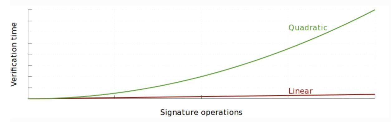 Essentially, doubling the size of a transaction doubles both the number of signature operations and the amount of data that needs to be hashed to verify each signature. This has already been observed in non-experimental environments: a normal single block can be verified in just 25 seconds, while a maliciously crafted transaction can take more than 3 minutes to verify.