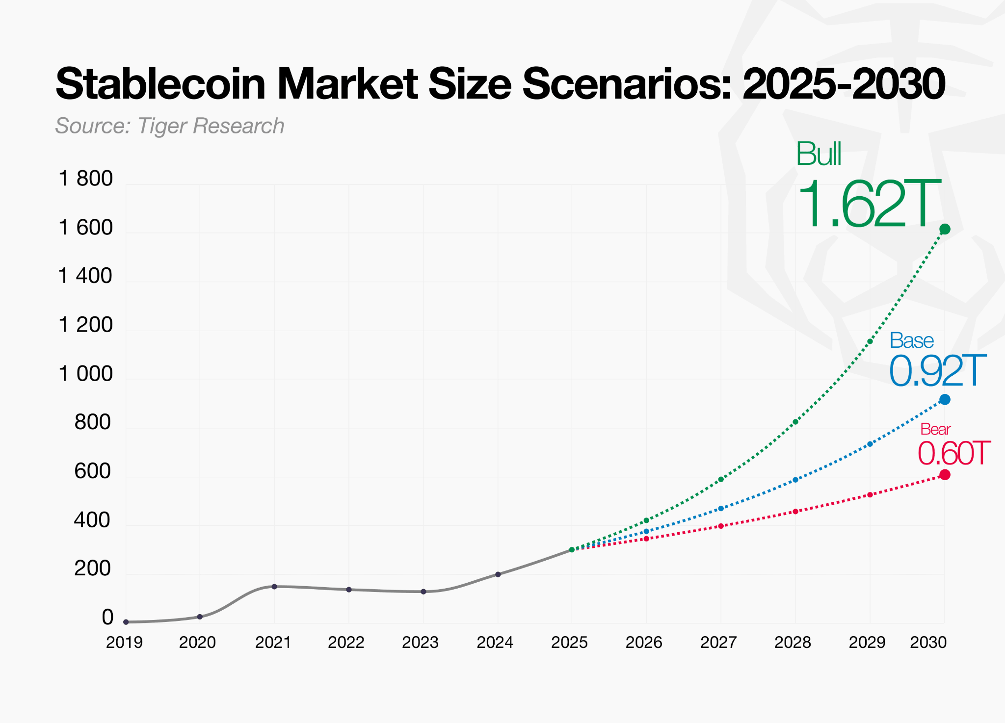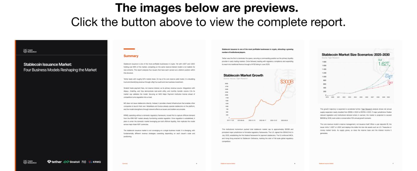 This growth trajectory is expected to accelerate further. Tiger Research analysis shows net annual supply expansion nearly doubled from $55B in 2024 to $101B in 2025. If major jurisdictions finalize relevant legislation and institutional demand enters in earnest, the market is projected to exceed $600B by 2030, even under a conservative 15% annual growth scenario.