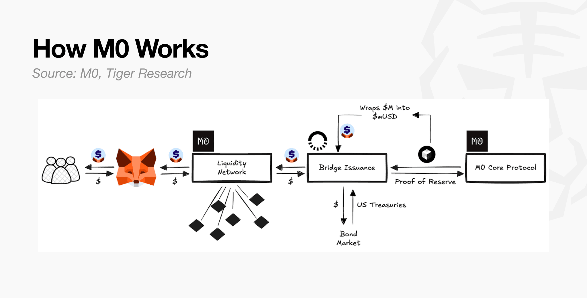 MetaMask leveraged M0 technology to design and construct its own stablecoin under the mUSD brand, and applied desired behavior and product layer on top. Bridge holds the regulatory licenses, manages U.S. Treasuries as collateral, and fulfils the platform obligations, ultimately minting and burning mUSD as demanded.