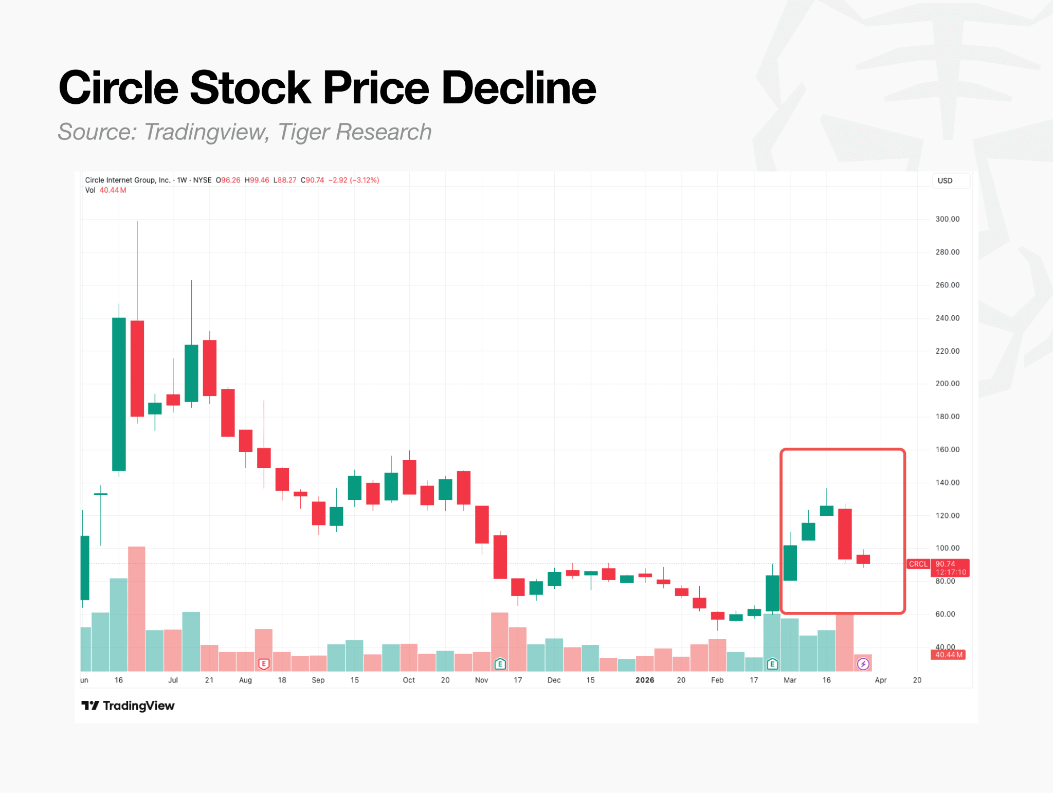 Unlike attestations, which confirm reserve composition at a single point in time, a full audit covers assets, liabilities, and internal control systems at a higher level of scrutiny. Markets took note. As Tether’s regulatory standing improved, Circle’s share price fell approximately 20%, a signal that resolving what had been Tether’s primary competitive weakness is reshaping the competitive landscape.