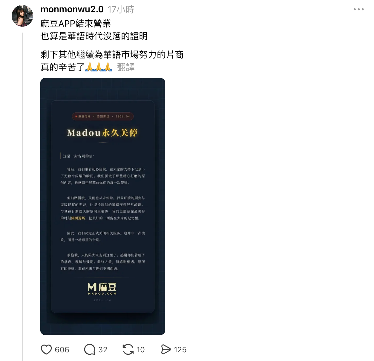 Famous actress Wu Mengmeng also shared the shutdown announcement on Threads, lamenting that the end of Madou was "proof of the decline of the Chinese-language film industry," and paying tribute to other film companies that are still working hard.