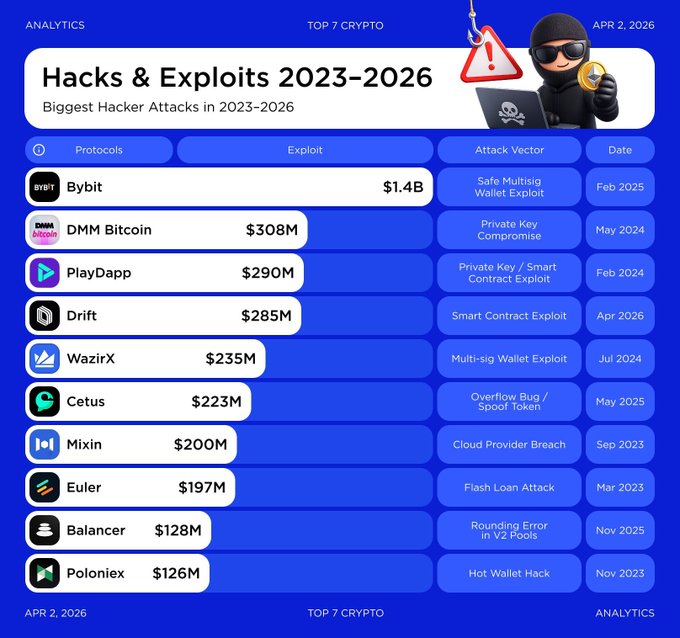 3. The Perp dex Drift Protocol project on Solana was hacked for $285 million (April 2026).