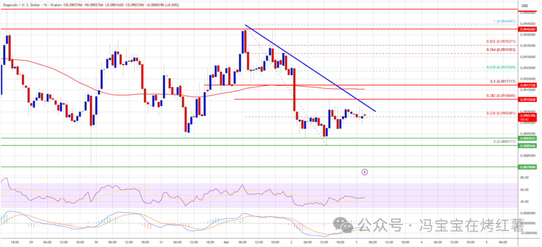 Although the price briefly rebounded from a low of 0.0889 to above 0.0900, the upward momentum was limited and it failed to even reach the 38.2% Fibonacci retracement level of the drop from the high of $0.0944 to 0.0889.