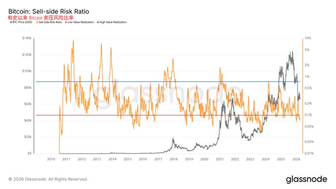 Looking at Bitcoin's Sell-Side Risk Ratio, although the current price of $BTC is not ideal, there is no indication of a large-scale sell-off or panic selling. The value has now returned to a low level, indicating that most people who were willing to sell had already sold in the previous round of fluctuations, and the remaining people are mostly observing. The Sell-Side Risk Ratio, which can be understood as the "sell pressure risk ratio," is mainly used to measure how strong investors' willingness is to sell Bitcoin and realize profits or losses in the current market. The higher this value (the closer it is to the blue line), the greater the on-chain value realization, and the stronger the market turnover and selling pressure. The lower the value (the closer it is to the red line), the fewer people are truly willing to sell, and the market is more inclined to fluctuate, consolidate, and accumulate more shares. In layman's terms, now is probably the time to gradually and slowly start buy the dips.