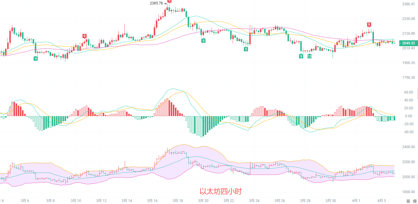 The 4-hour chart shows a narrow, weak trading range. The moving average system has converged and is trending downwards; the 20-day, 30-day, and 60-day moving averages are all above the price, suppressing any rebound and indicating a lack of upward momentum in the short term. The MACD indicator shows a slight increase in the green bars, suggesting strengthening downward momentum and a potential test of support levels. The Bollinger Band middle line at 2081 is the resistance level, and the lower band at 2010 is the support level. With the price trading between the middle and lower Bollinger Bands, a directional move is imminent, and a breakout from this range should be closely monitored.