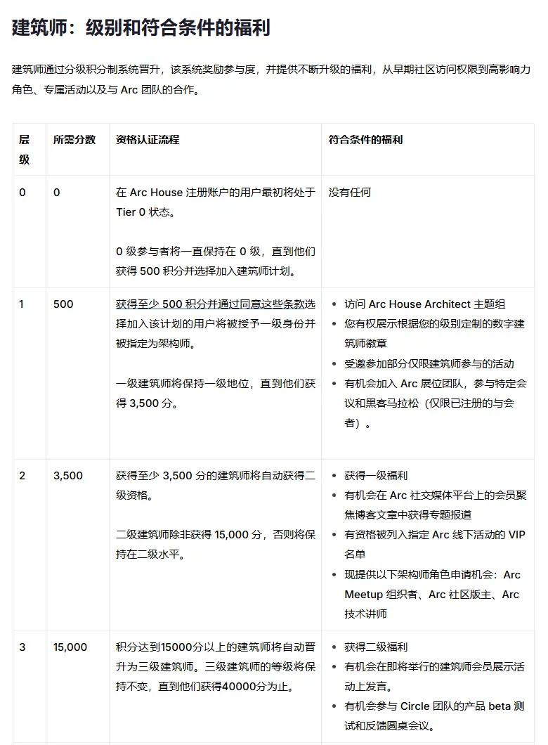 Additionally, reaching 500 points will unlock the "Architect Role Level 1". There are 5 levels in total, and you can only apply once you have reached the required points. The requirements and benefits for each level are as follows: