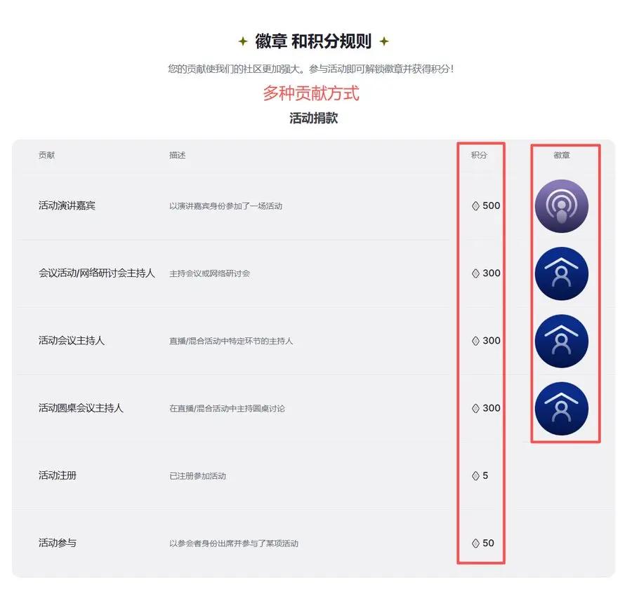 Contribution categories: There are five categories in total: activity contributions, content contributions, forum contributions, community activities, and other contributions. In addition to points rewards, different contributions also have additional badge rewards.