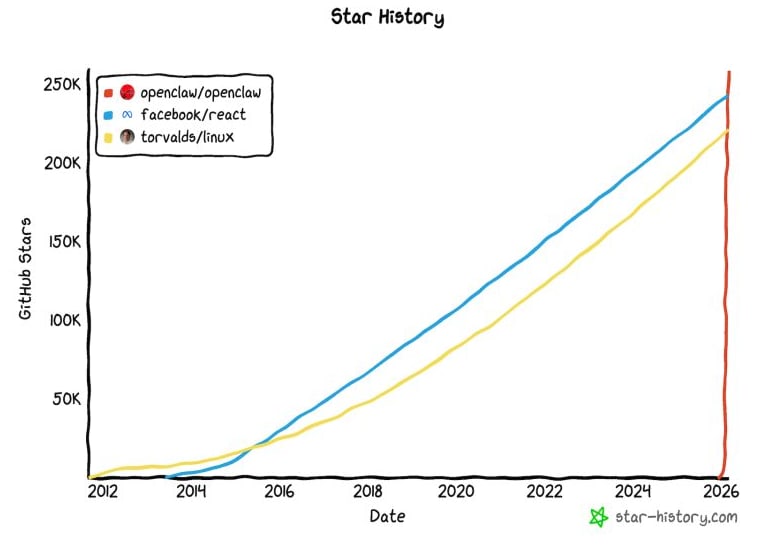 Before I talk about Hermes, I should mention OpenClaw. If you’ve been following the AI space at all (and tbh even if you haven’t), you’ve probably heard of it. OpenClaw was the first AI agent tool that went truly mainstream in early 2026. It became the fastest-growing open source project in history, with hundreds of thousands of people downloading and running it. This chart is truly insane, comparing its github star history to the enormous projects Linux and React: