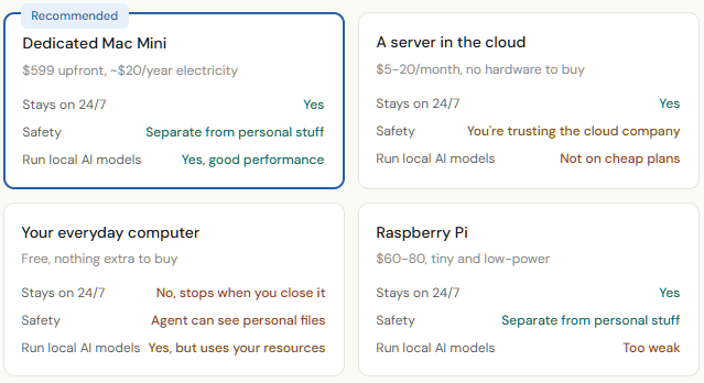 There’s also a safety argument. Your AI agent has access to whatever computer it runs on. Running it on a separate machine with nothing personal on it means the worst-case scenario is much less scary. Speaking of safety…