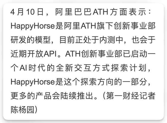 Alibaba has confirmed that HappyHorse is a model developed by its Innovation Business Unit (ATH), currently in internal testing, and its API will be released soon. ATH's Innovation Business Unit has launched a plan to explore new interaction methods for the AI era, and HappyHorse is part of this exploration; more products will be launched successively. (Yicai) Recently, the video generation model HappyHorse-1.0 topped the Artificial Analysis Video Arena leaderboard, scoring 84 points higher than Seedance 2.0.