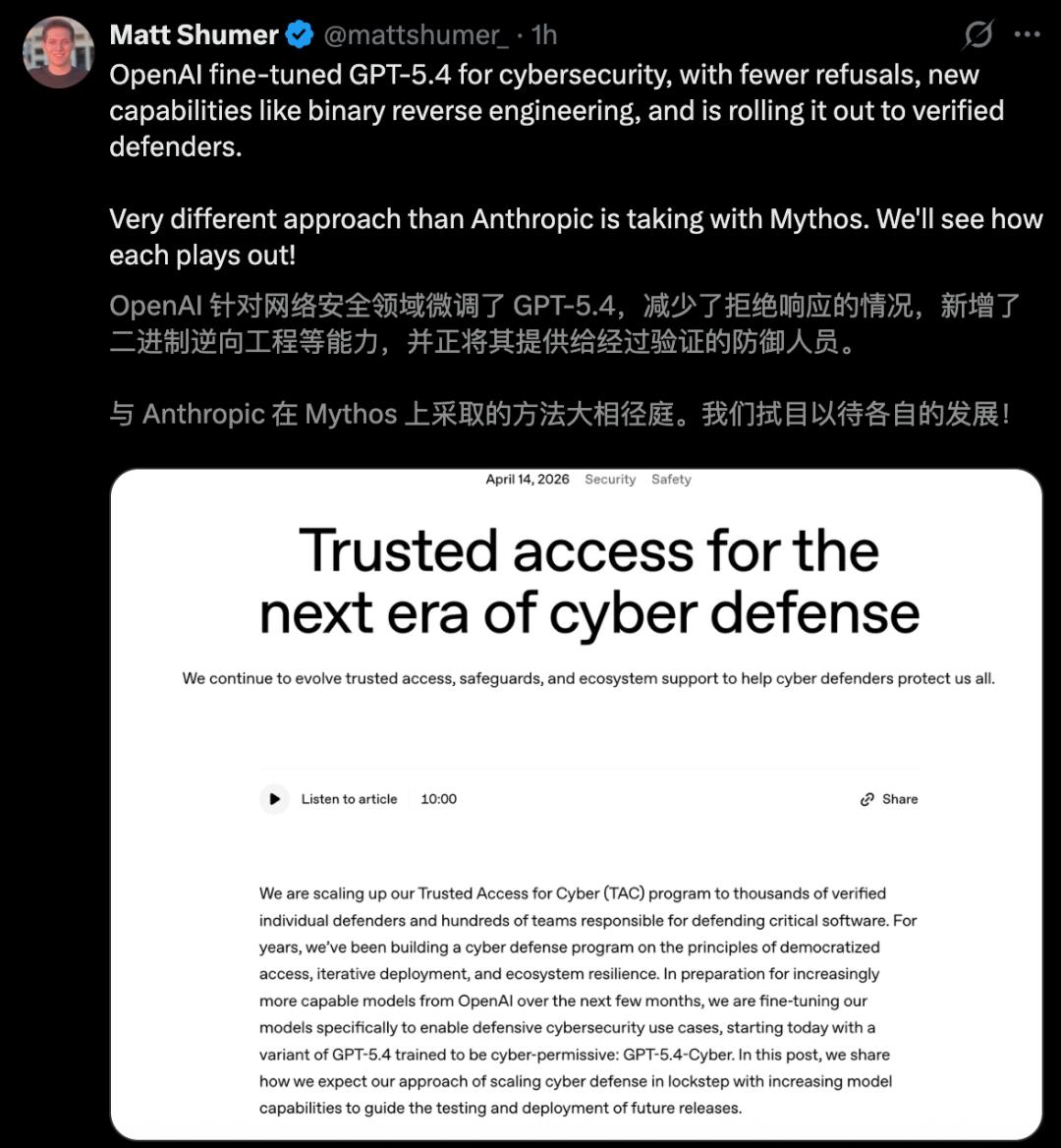First came Claude Mythos, then came GPT-5.4-Cyber.