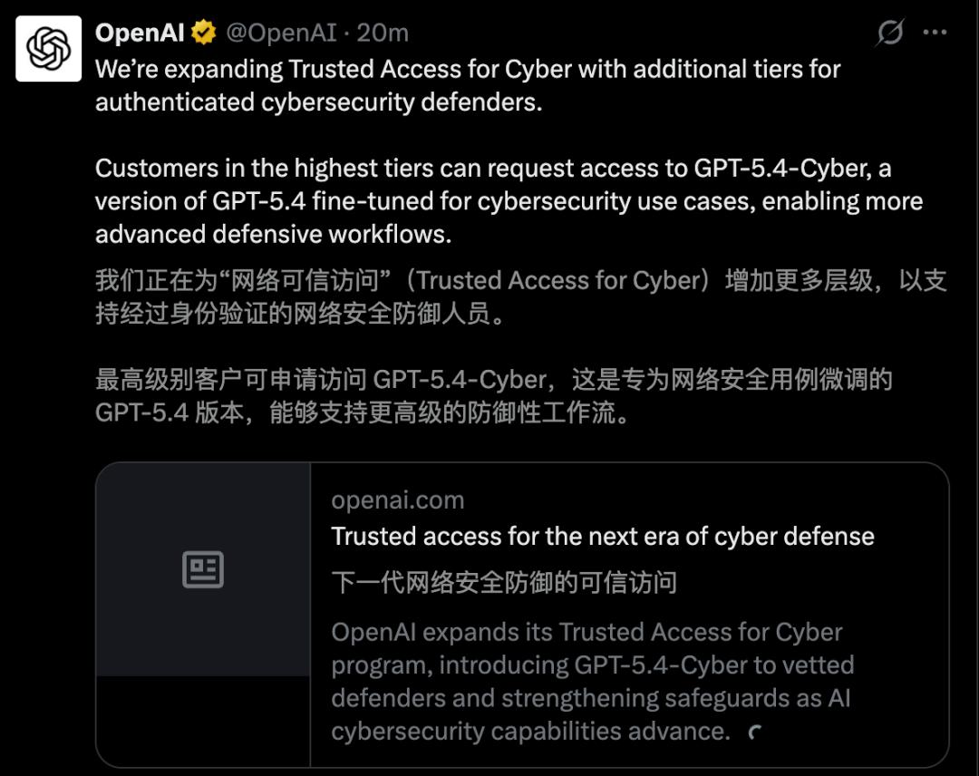Just now, OpenAI officially released the new GPT-5.4-Cyber model, which is only available to cybersecurity experts.