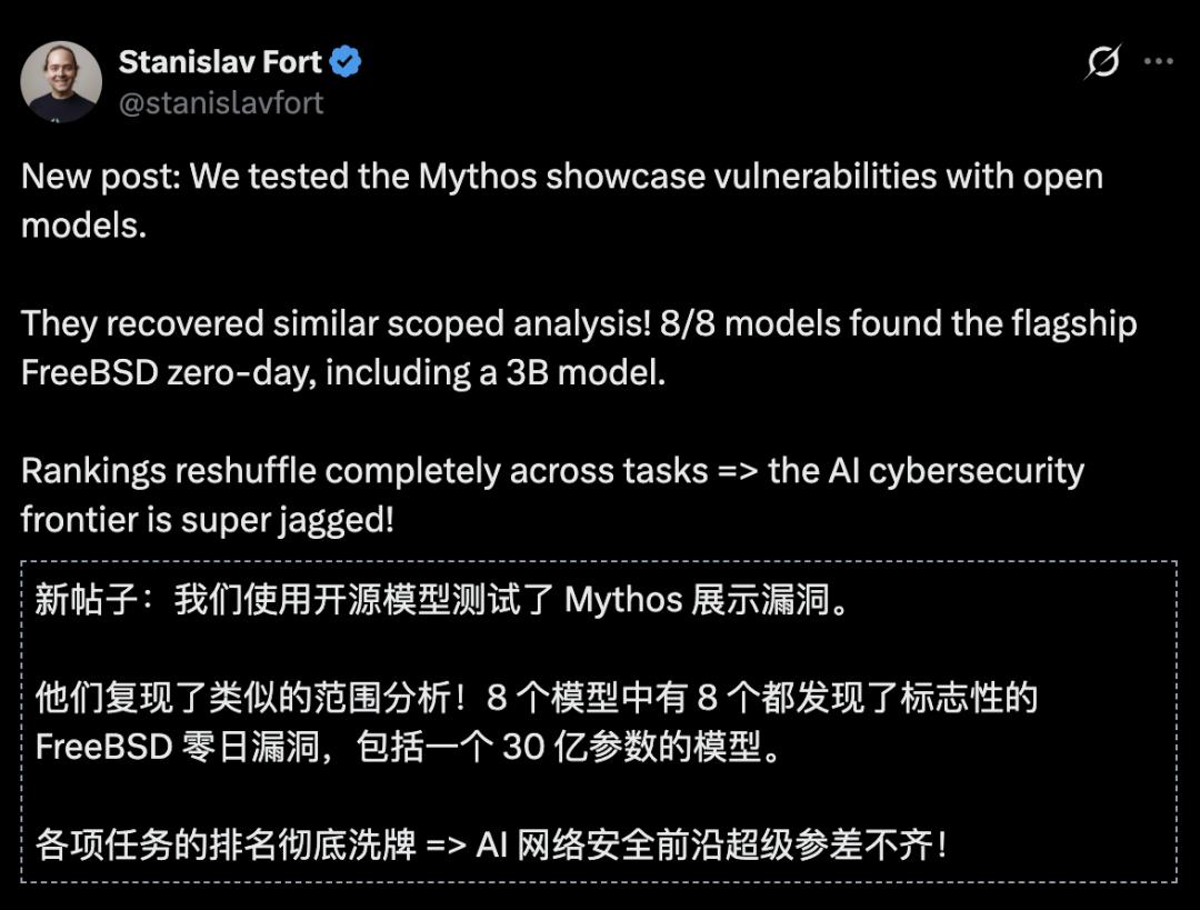 Currently, some smaller models, including GPT and DeepSeek, already possess the ability for Mythos to discover some vulnerabilities.