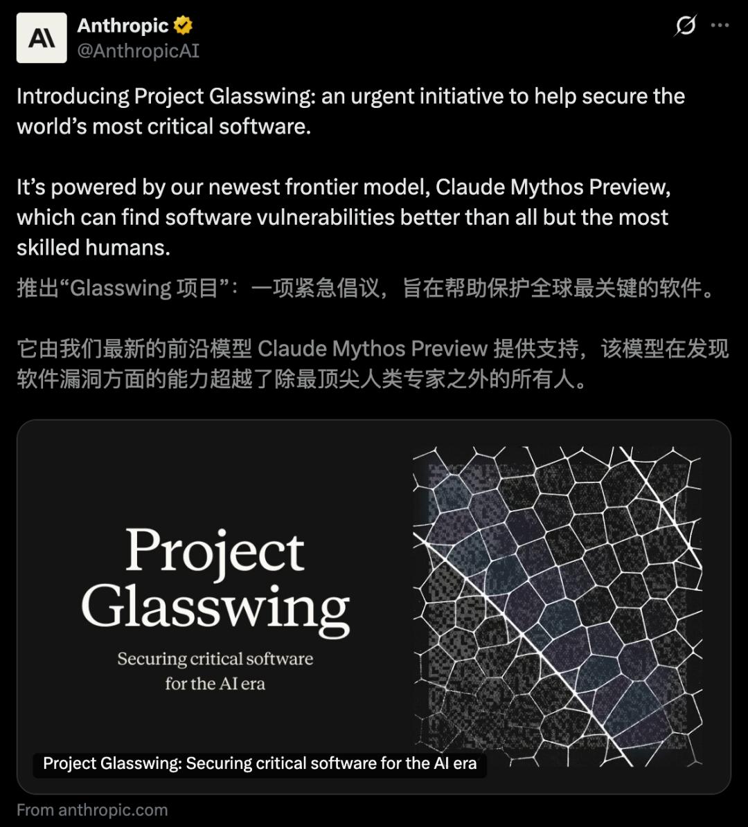Last week, Claude Mythos (preview version) released a comprehensive benchmark test. At the same time, Anhtropic joined forces with 40 giants to launch "Project Glasswing".