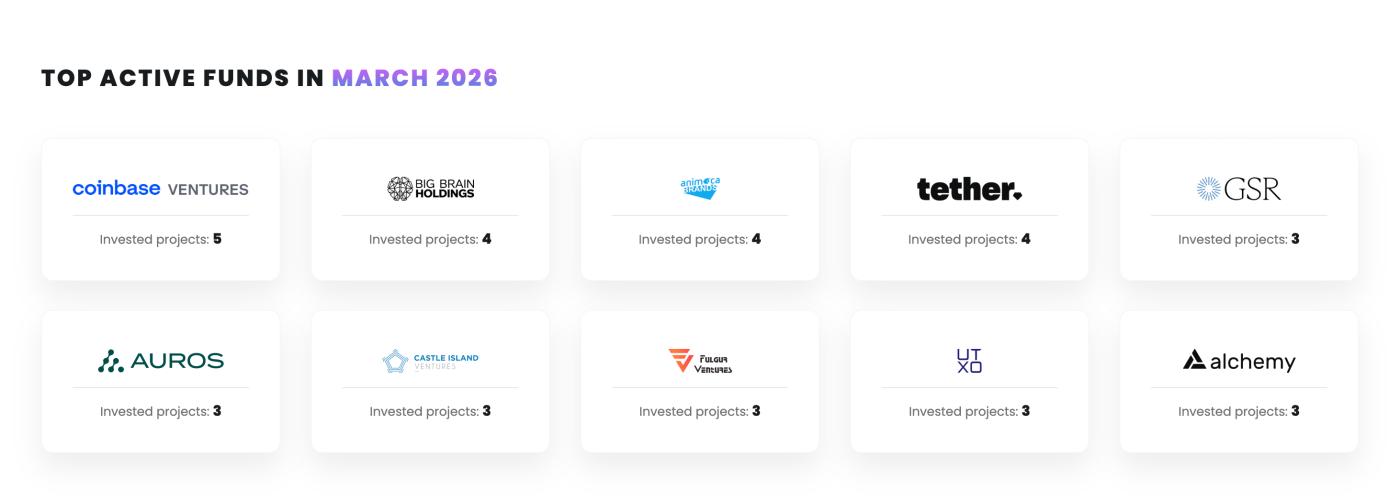 Coinbase Ventures topped the list of institutional investors with 12 investments, more than double that of the second-place investor. Following them were Tether (8 investments), Animoca Brands (7 investments), CMT Digital (6 investments), and tied with a16z crypto, Castle Island, Big Brain, and Galaxy Digital (5 investments each).