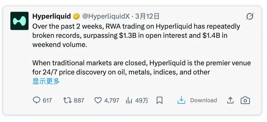 Because it was the weekend, traditional markets around the world were closed, but @HyperliquidX was open, and a large number of users flocked to on-chain trading of crude oil for the first time. On March 2, when commodity trading resumed, Brent crude oil jumped, and RWA trading volume on Hyperliquid saw its first peak.